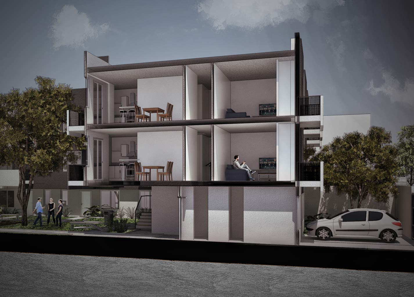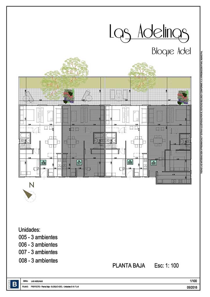 Ediliciamente LAS ADELINAS tendrá cincuenta y cuatro departamentos de uno, dos y tres ambientes, ambientes con inmejorables visuales al parque central, y grandes dimensiones. El complejo cuenta con cocheras cubiertas y descubiertas en planta baja.
