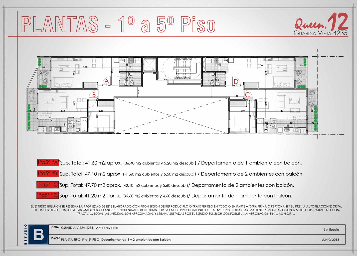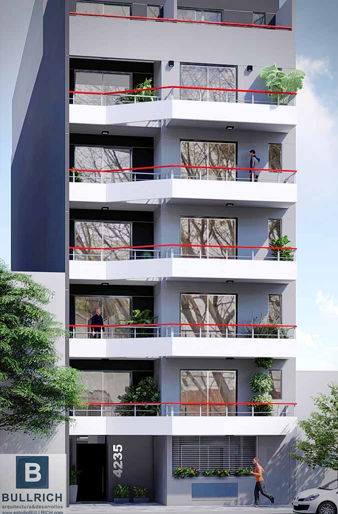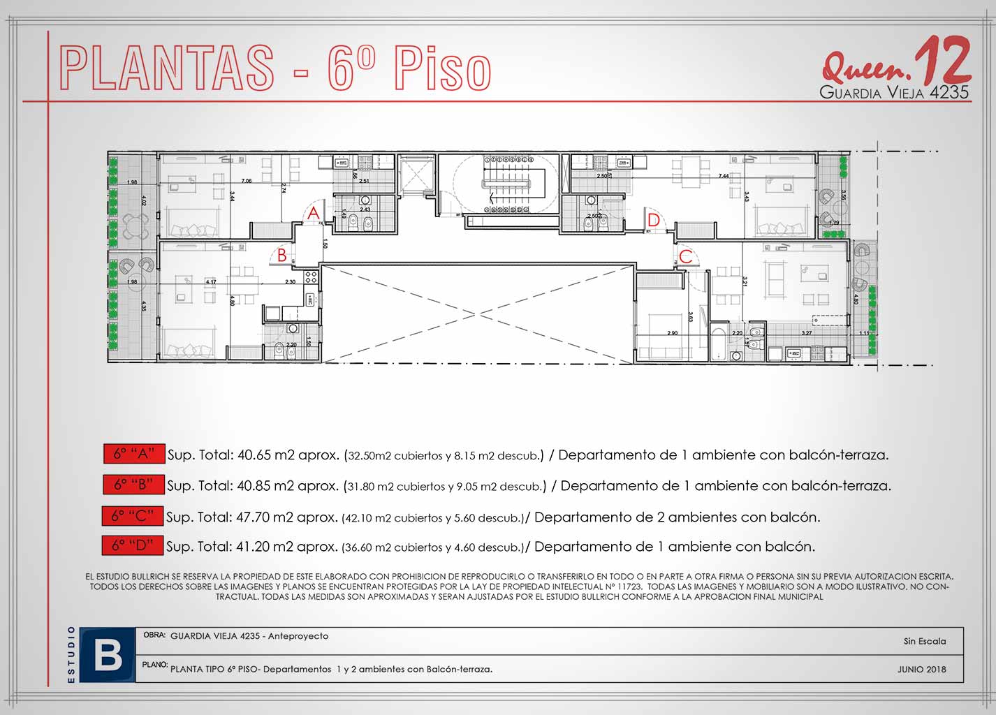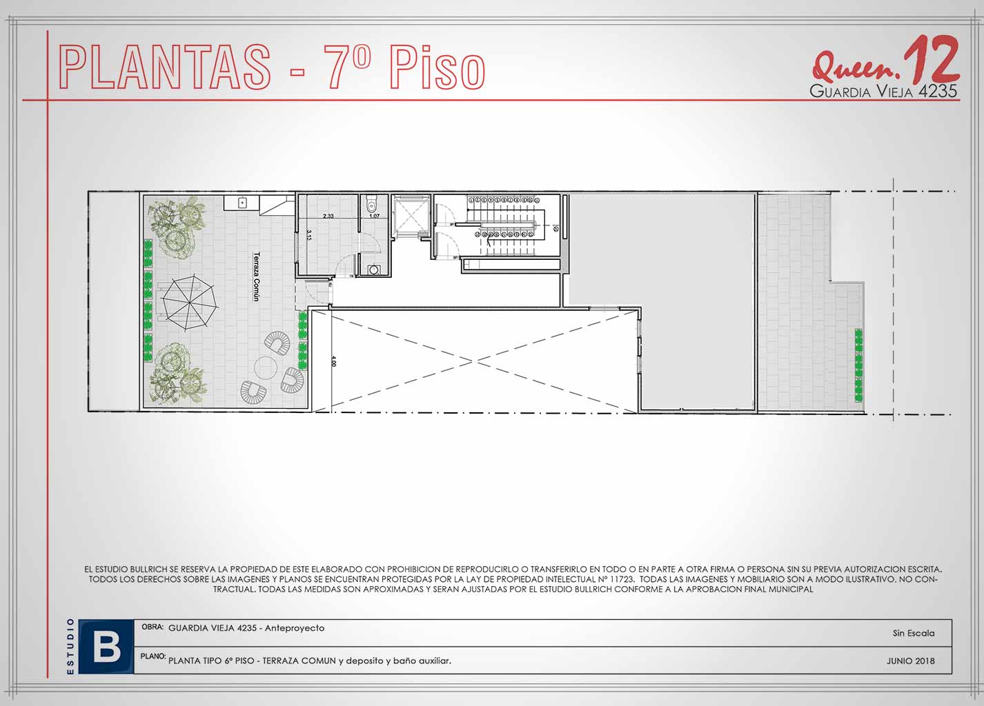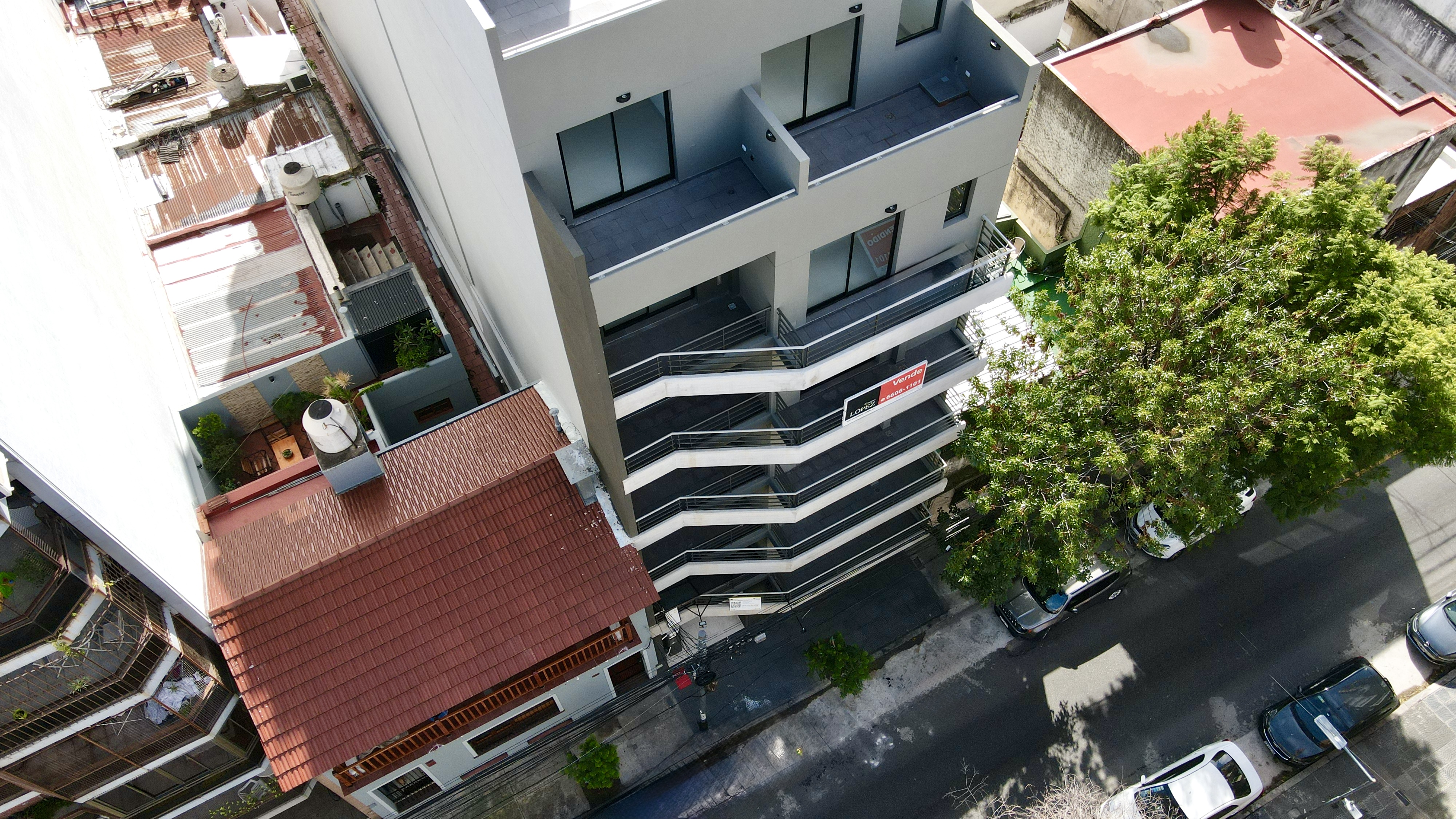 El edificio consta de 27 unidades de 1 y 2 ambientes desarrollados en planta baja + 6 pisos. Cuenta en el 7 piso con una terraza de uso común, con un lugar de guardado y un toilette.