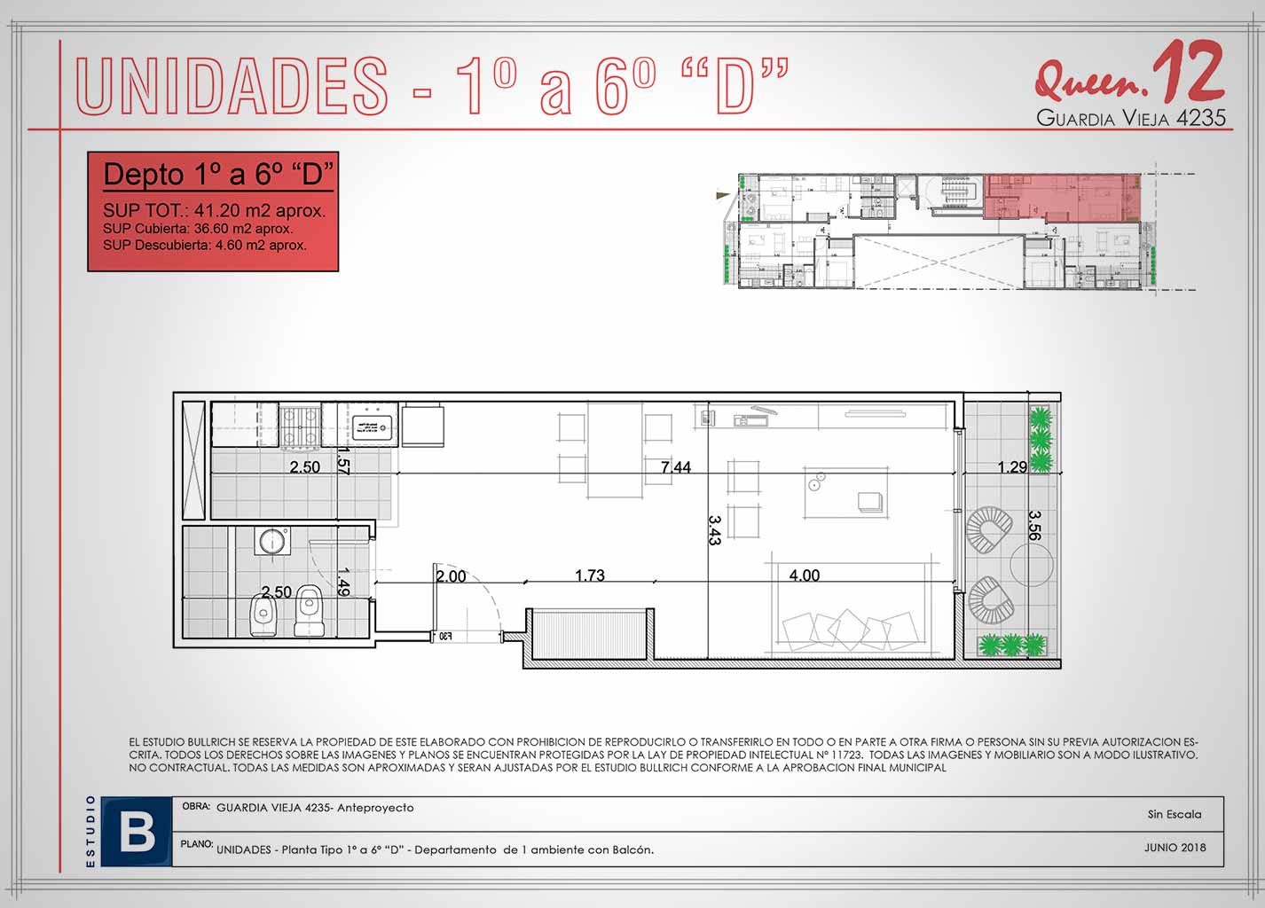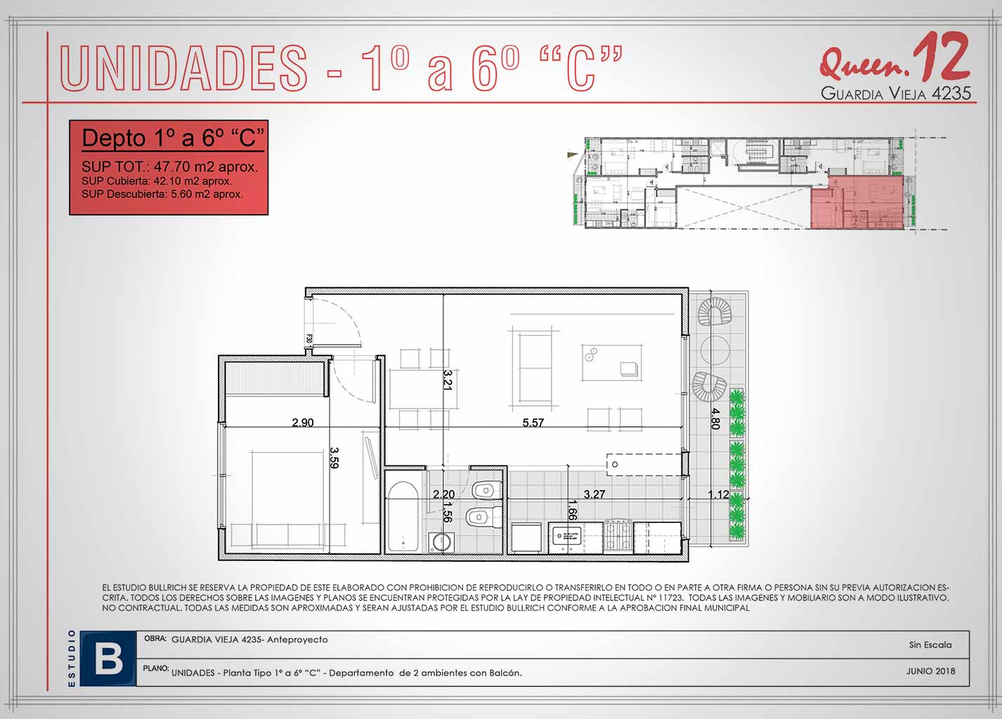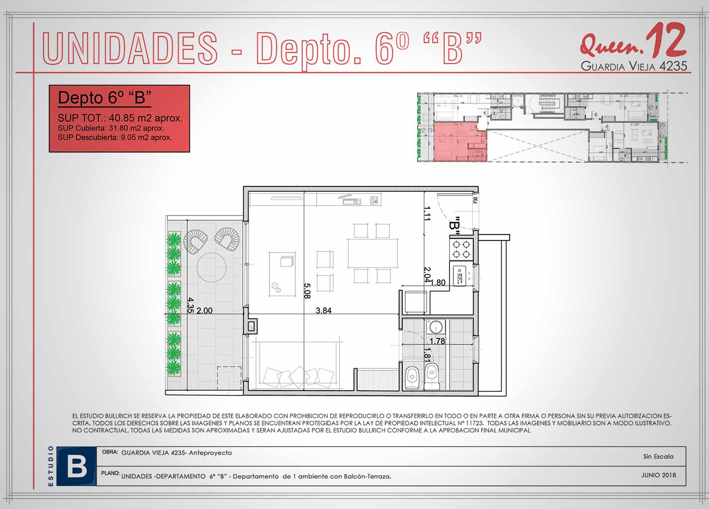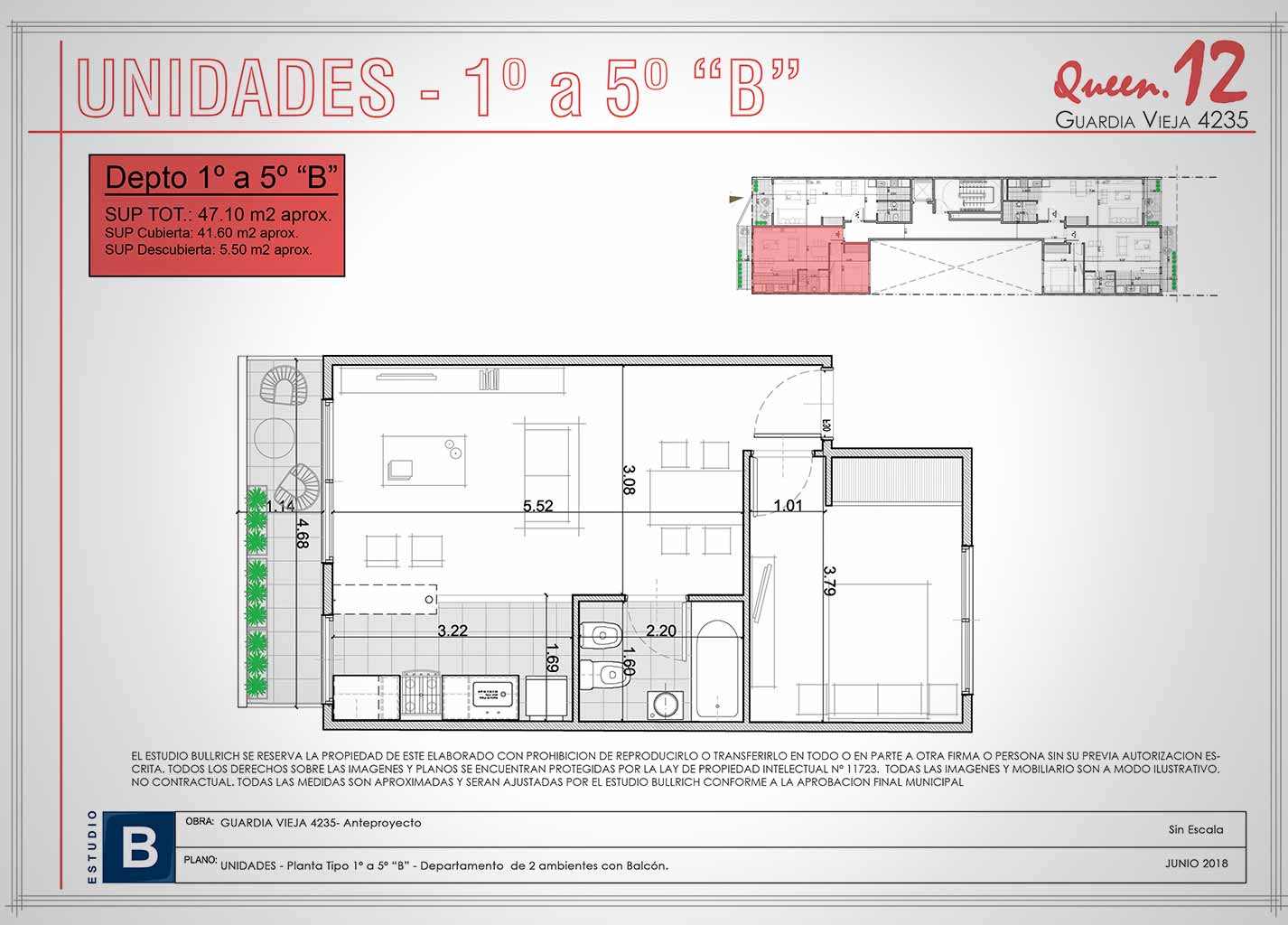 El edificio consta de 27 unidades de 1 y 2 ambientes desarrollados en planta baja + 6 pisos. Cuenta en el 7 piso con una terraza de uso común, con un lugar de guardado y un toilette.