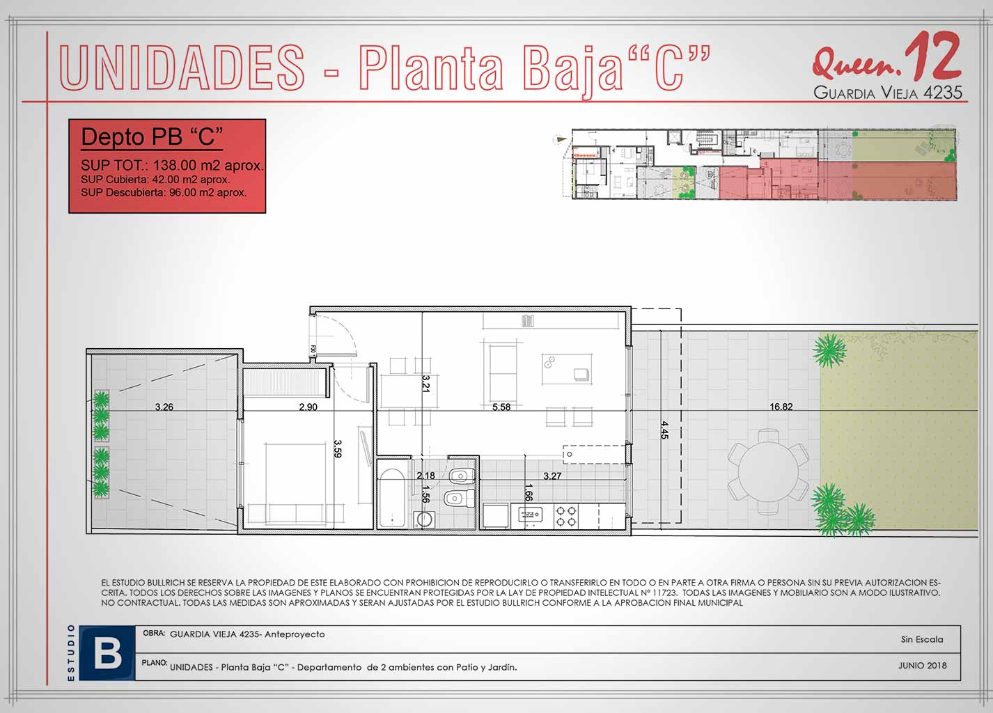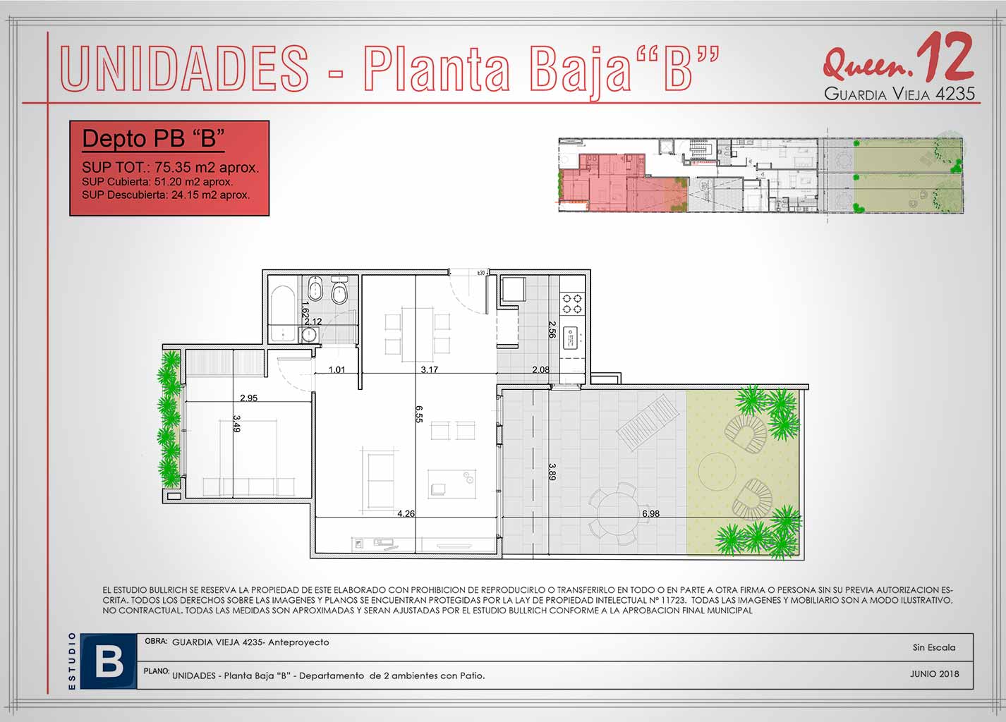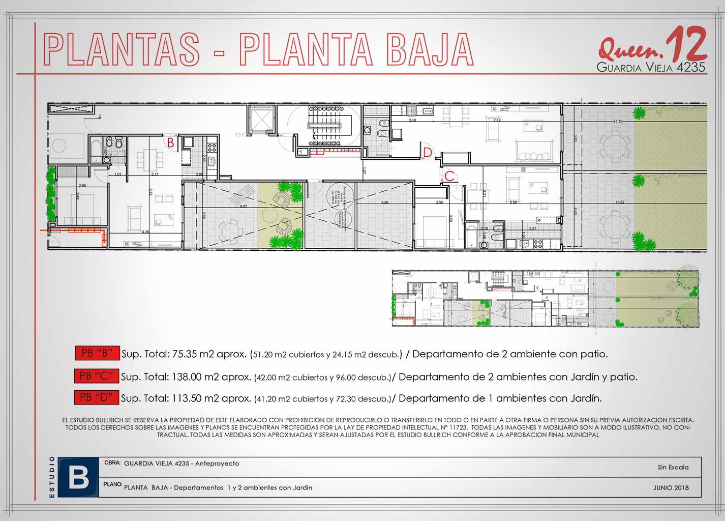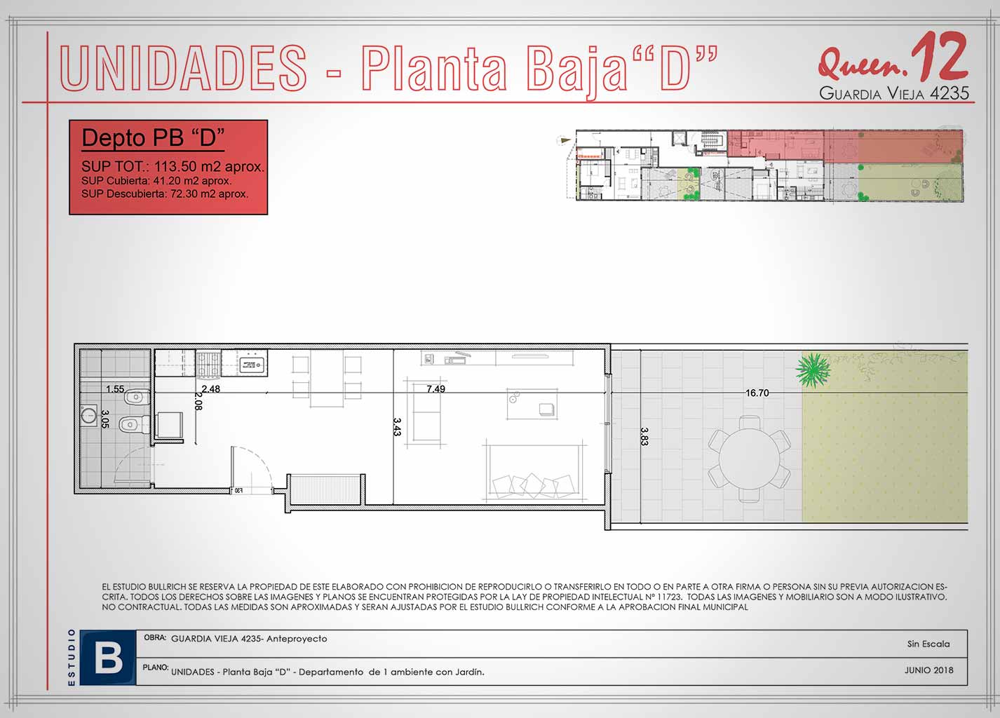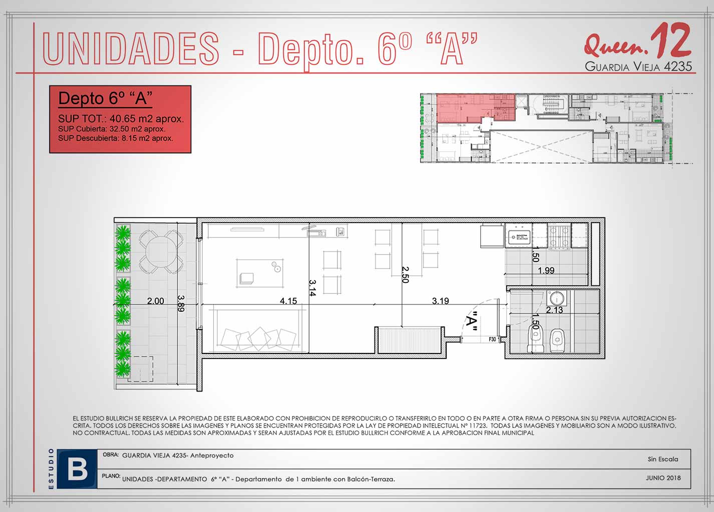 El edificio consta de 27 unidades de 1 y 2 ambientes desarrollados en planta baja + 6 pisos. Cuenta en el 7 piso con una terraza de uso común, con un lugar de guardado y un toilette.