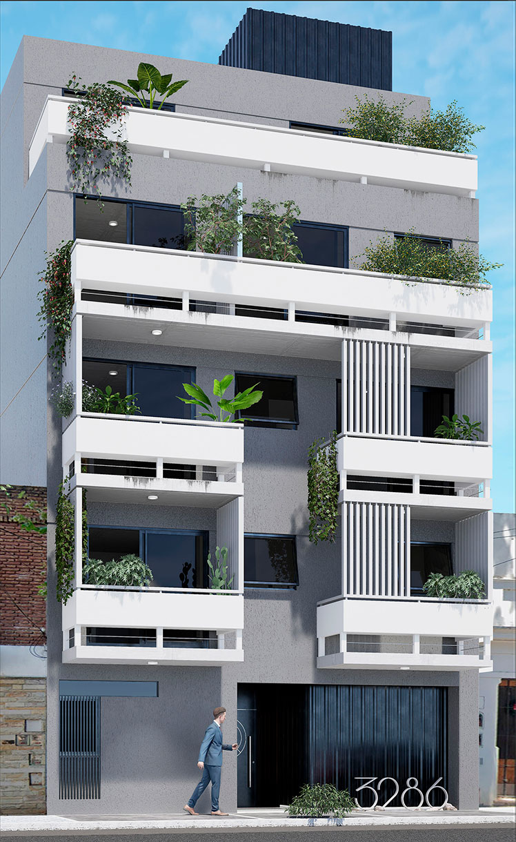 La imagen exterior del edificio sigue lineamientos estéticos modernos, con detalles de hierro, vidrio, tarquini y hormigón, donde la construcción se mezcla con el entorno urbano y la vegetación, generando espacialidad y entorno, lo cual mejora la calidad de vida.