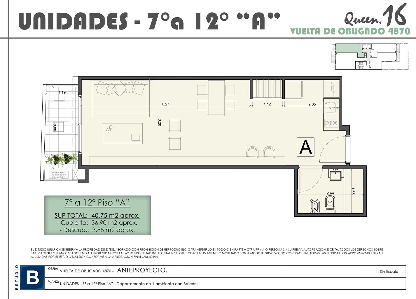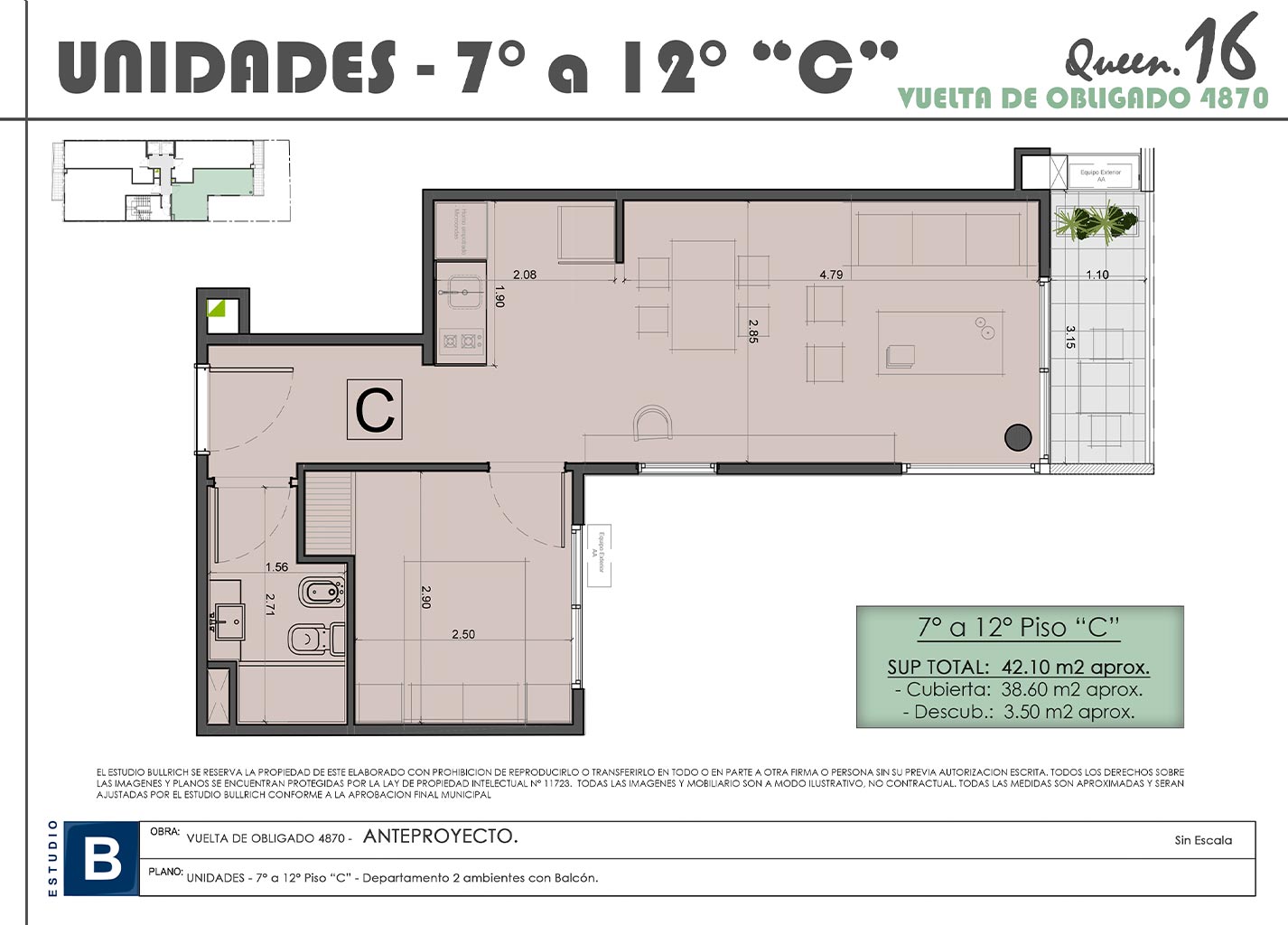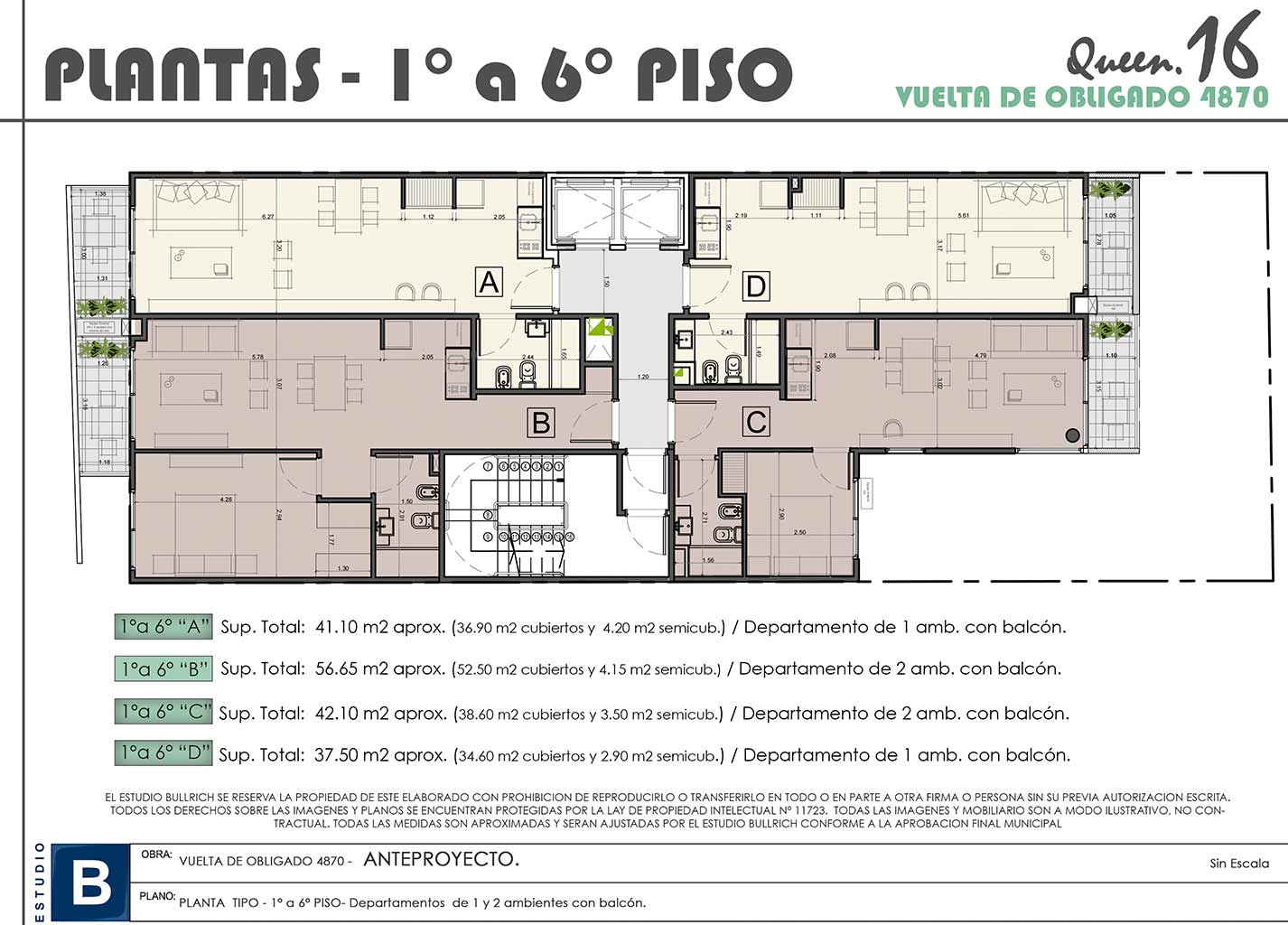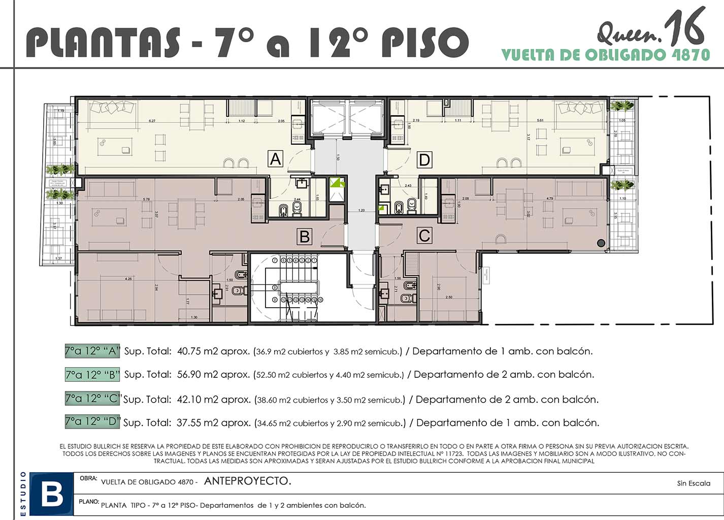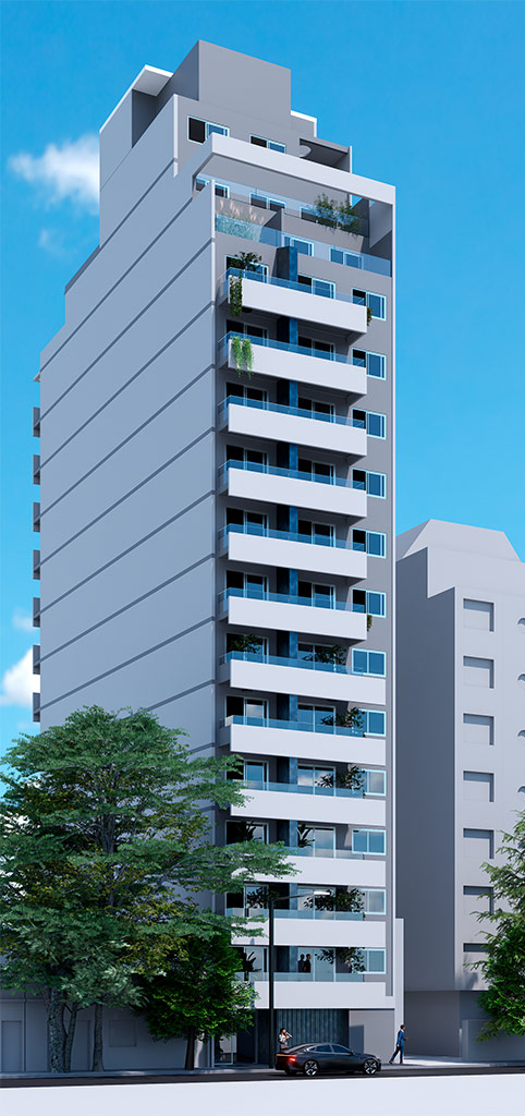 La planta tipo se desarrollará del piso 1º al 12º y contará con 4 departamentos por piso, 2 al frente (de 1 y 2 ambientes) y dos al contrafrente (de 1 y 2 ambientes), todos con balcón.