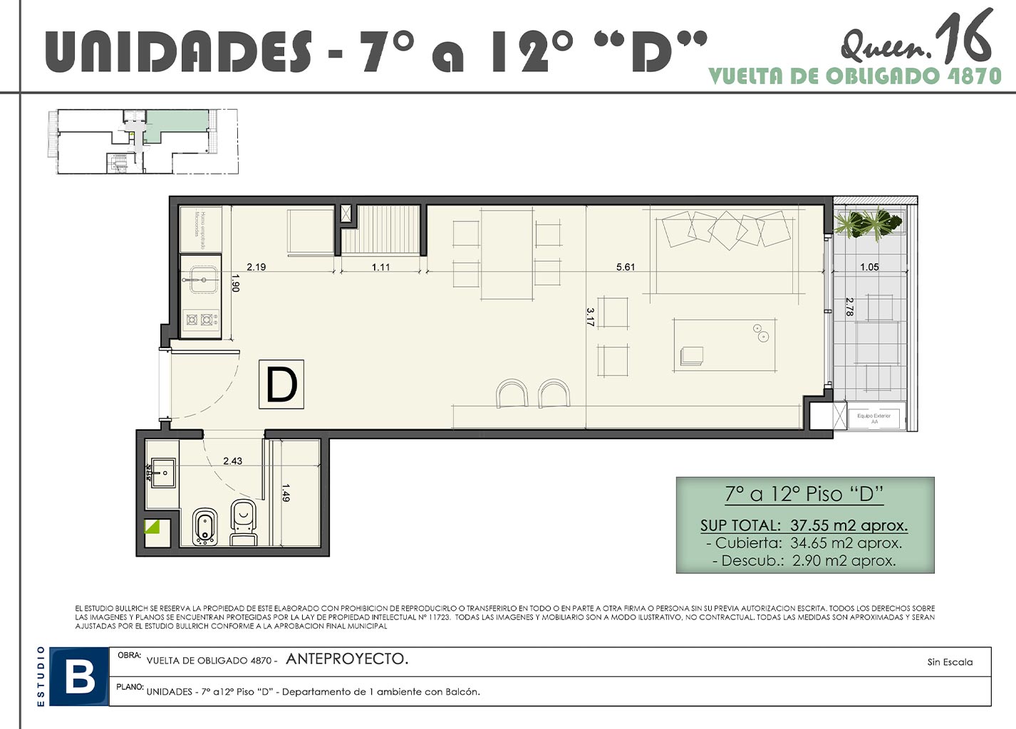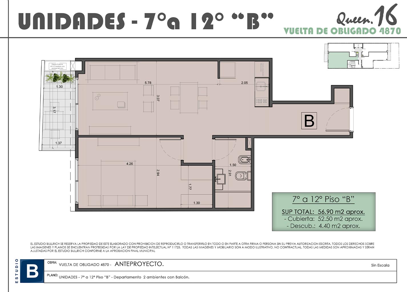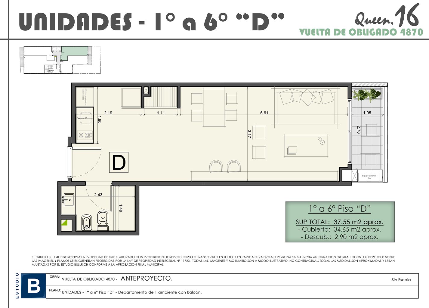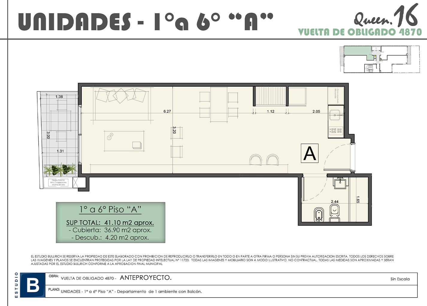 La planta tipo se desarrollará del piso 1º al 12º y contará con 4 departamentos por piso, 2 al frente (de 1 y 2 ambientes) y dos al contrafrente (de 1 y 2 ambientes), todos con balcón.