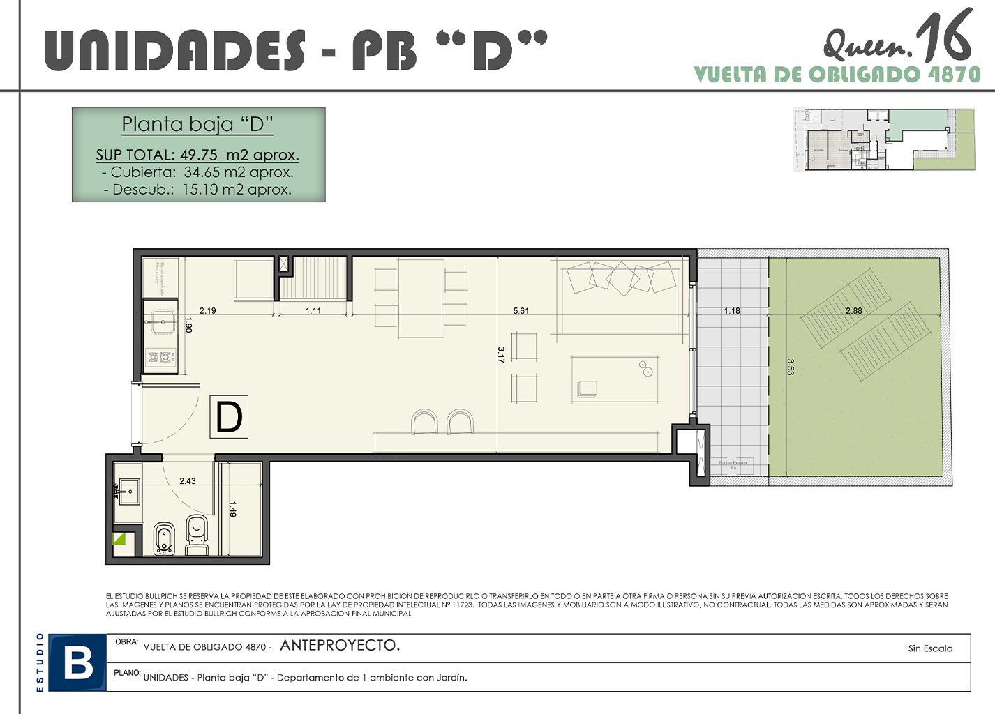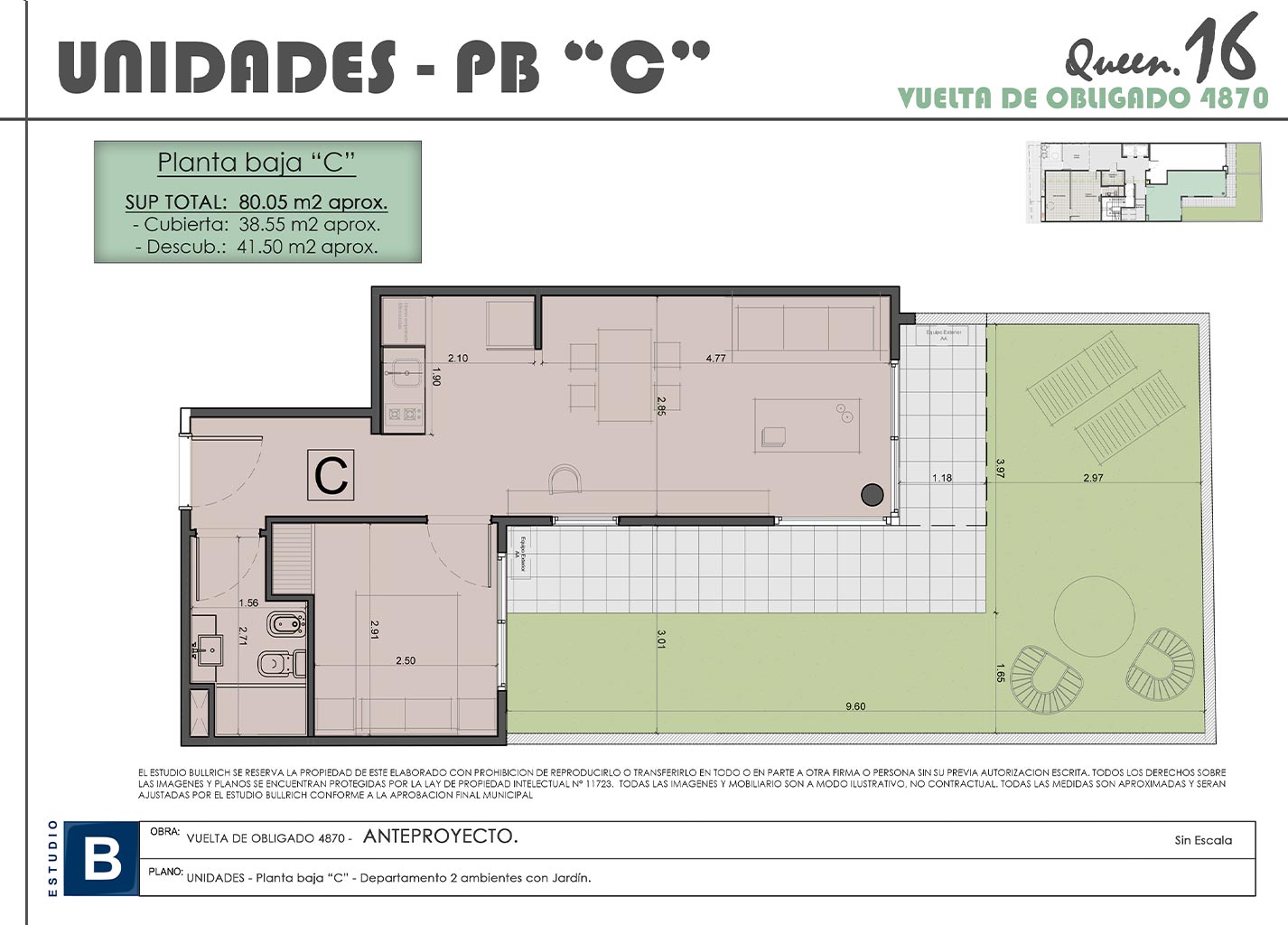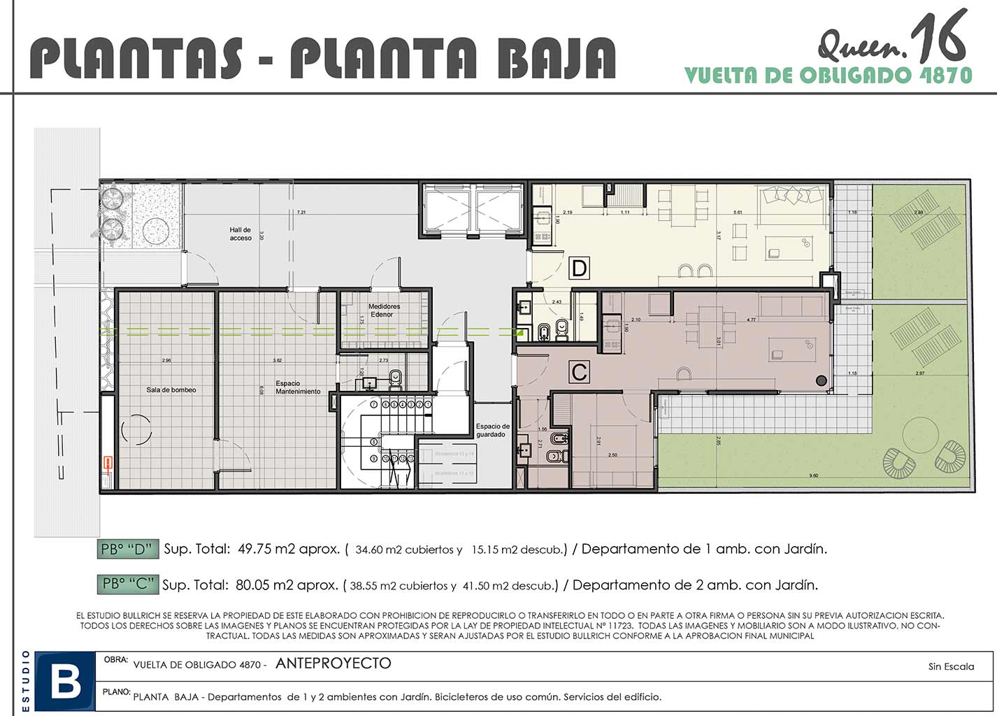 En planta baja se ingresará por un hall de acceso abierto con una buena decoración. En este nivel se encontrarán los servicios (luz, gas, agua y auxiliar de portería) y al contrafrente habrá dos unidades con jardín, una de 1 ambiente y otra de 2 ambientes.