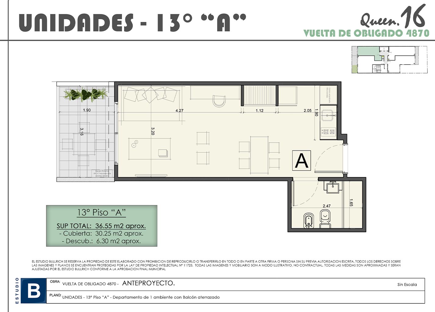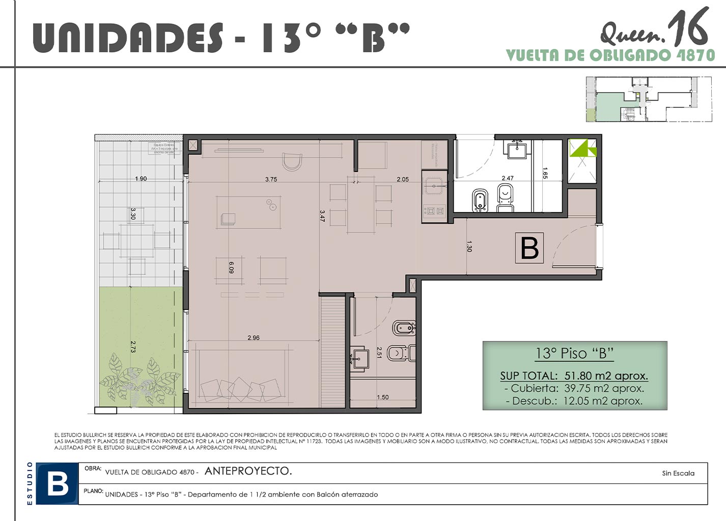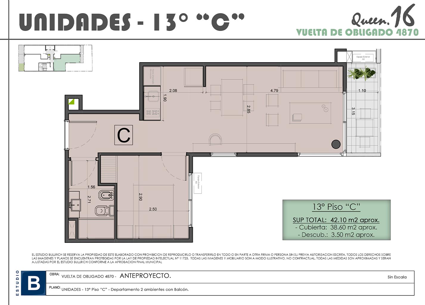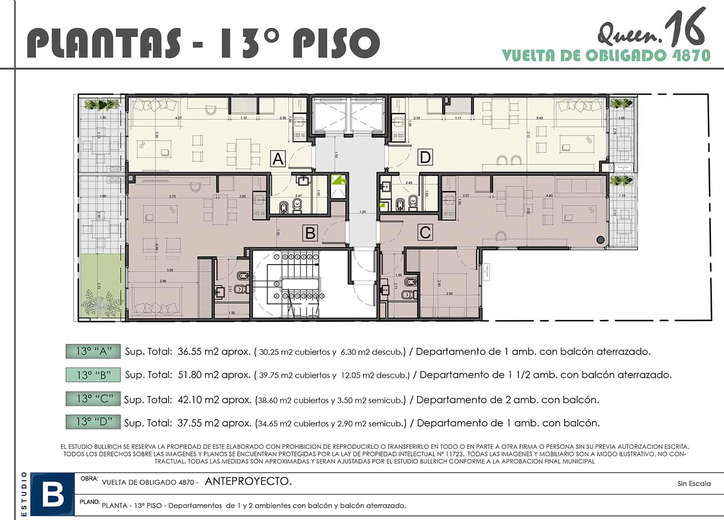 El piso 13º corresponderá al 1er retiro de frente obligatorio y tendrá 2 unidades al frente de 1 ambiente con terraza y 2 departamentos al contrafrente de 1 y 2 ambientes con balcón.