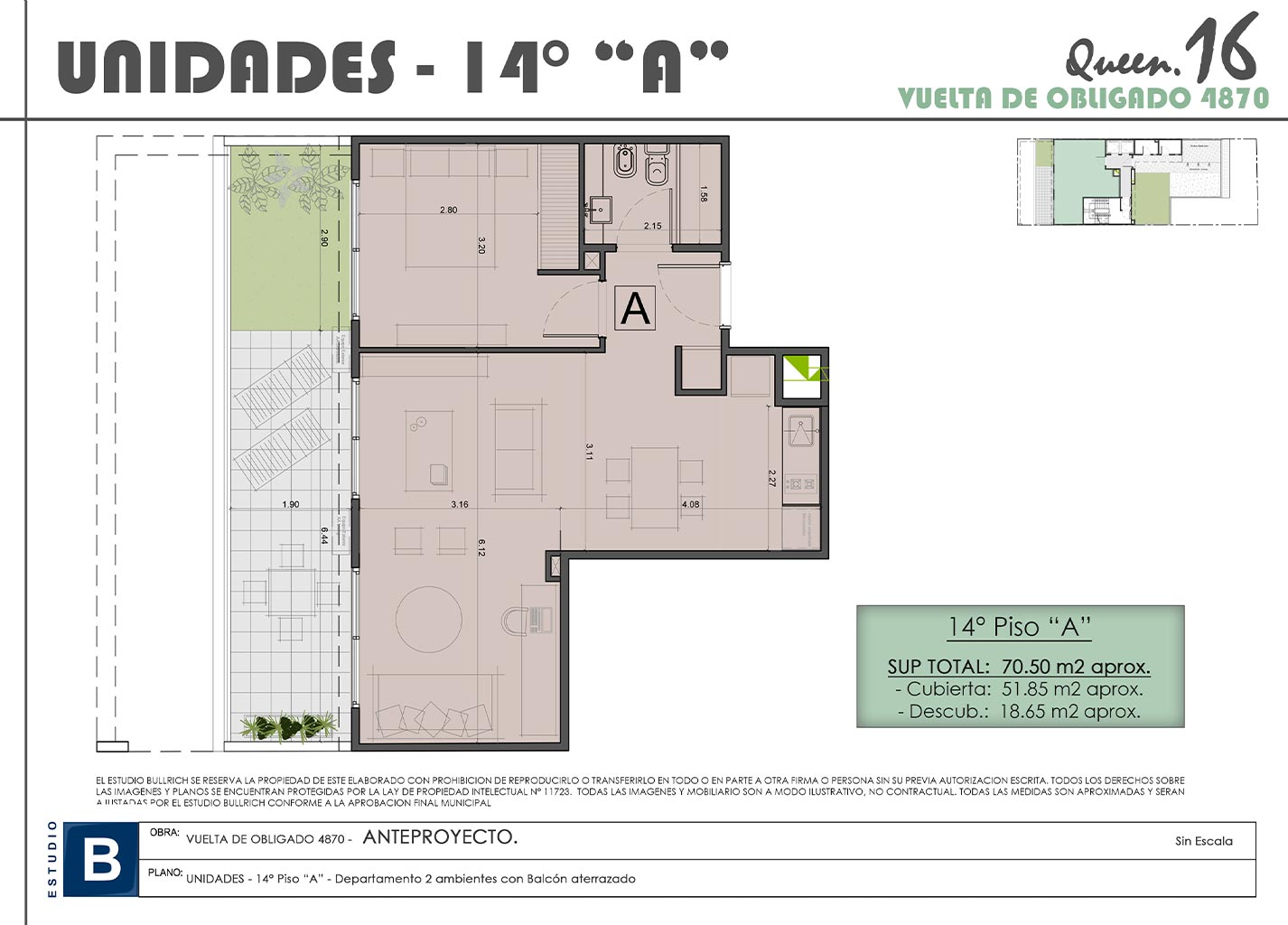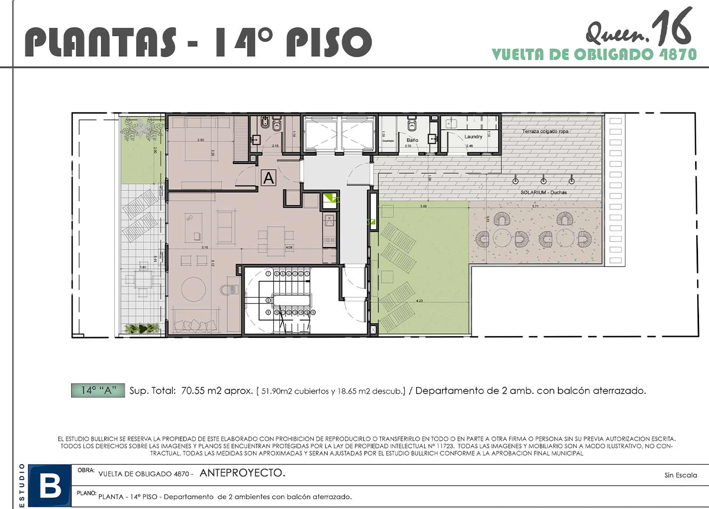 En el piso 14 habrá una unidad al frente de 2 ambientes y medio con terraza y al contrafrente se encontrará una terraza de uso común con una hermosa vista abierta con solarium, terraza verde y sector de duchas, un baño, laundry y sector de colgado de ropa.