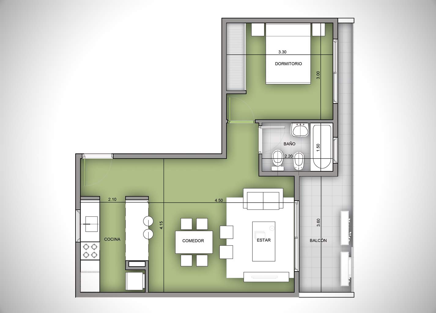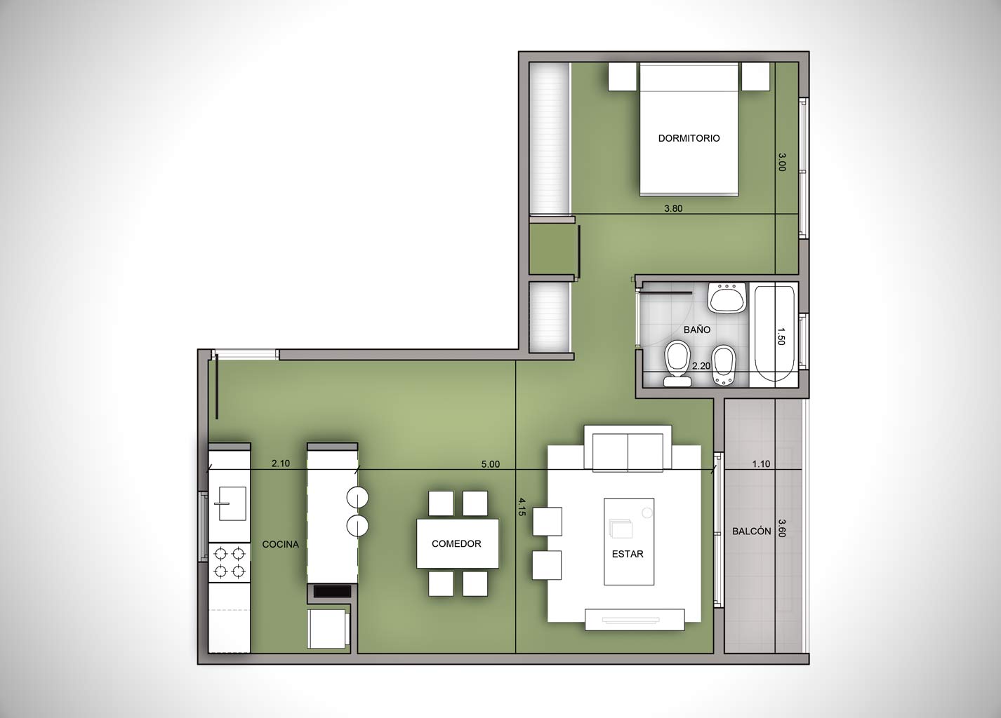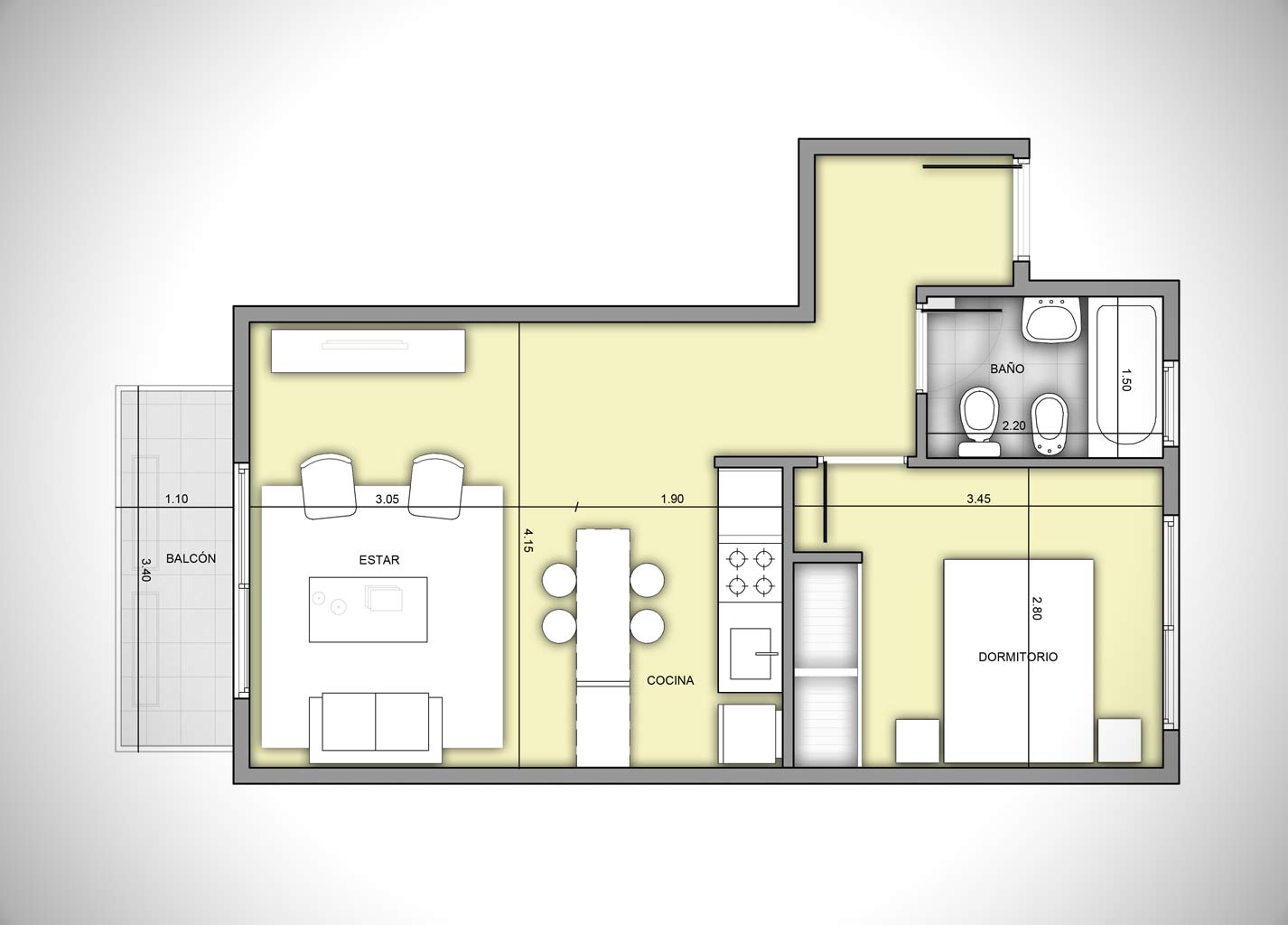 Unidades 2 Ambientes (1° a 3° Piso - Frente)