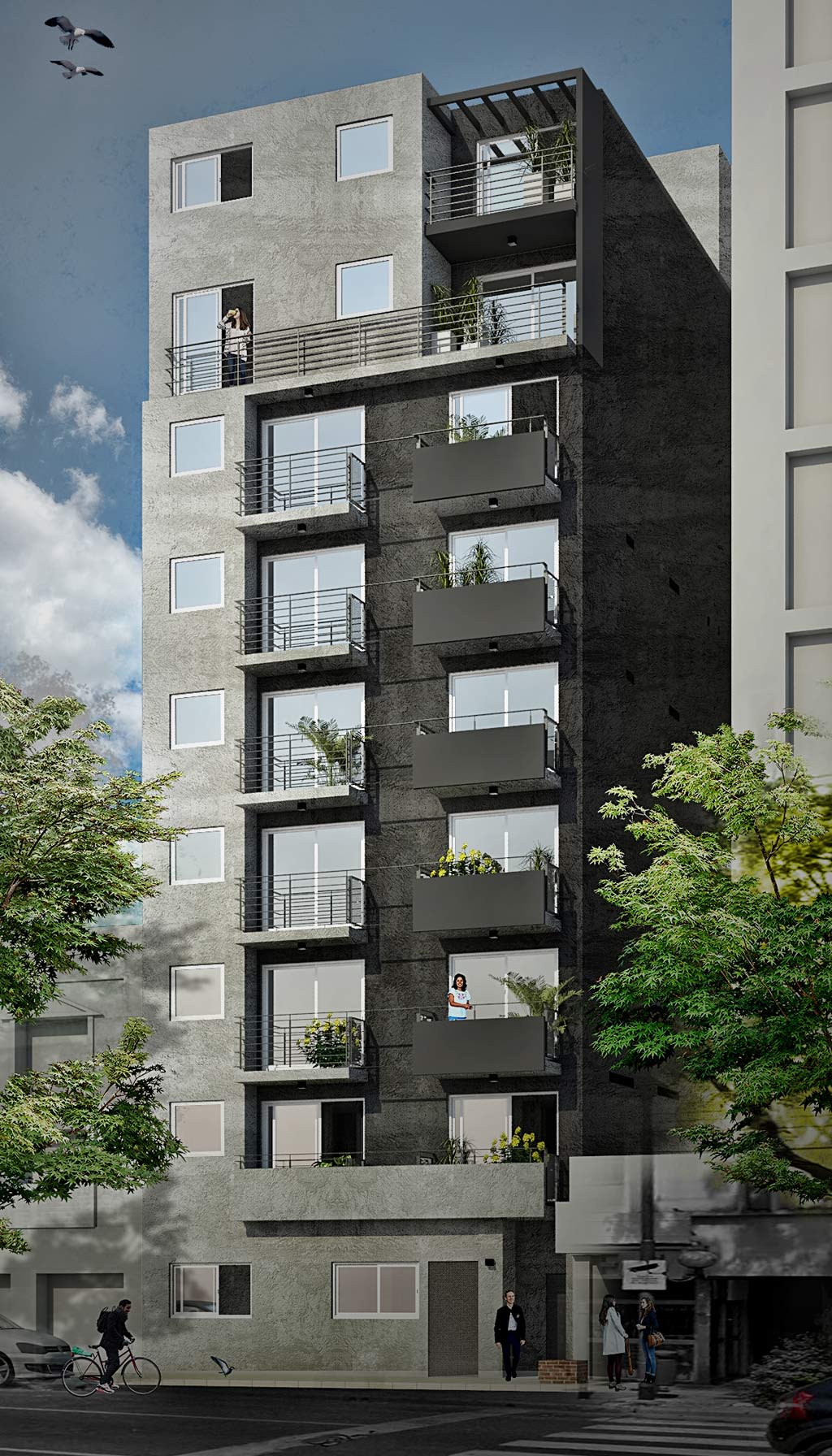 El edificio consta de 31 unidades de vivienda de 1; 2 y 3 ambientes desarrollados en PB + 8 pisos.